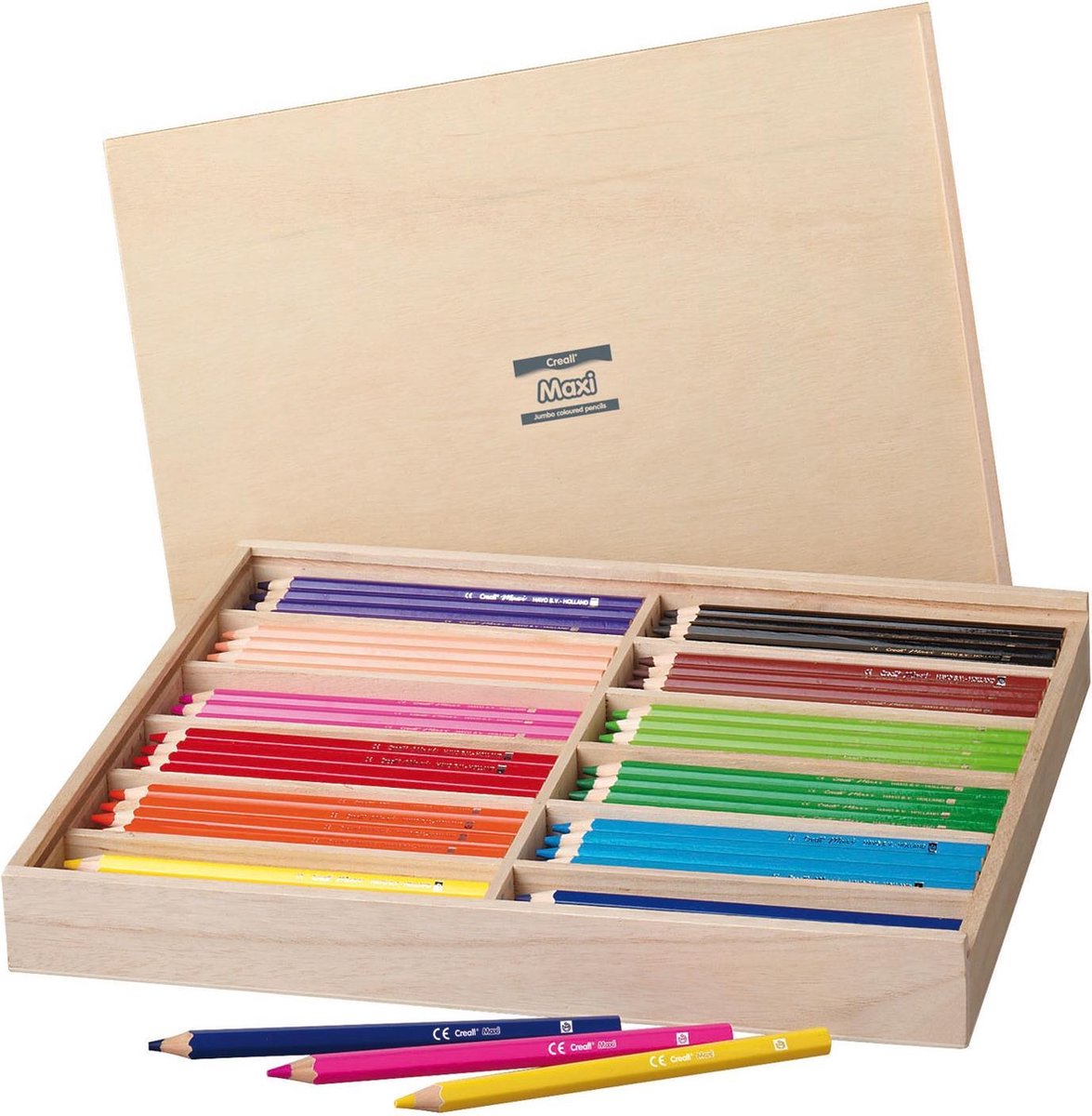 Handige houten opbergkist met 12 verschillende kleuren potloden. Per kleur vind je 12 potloden in de kist, ideaal voor gebruik in de klas. Klassiek zeskantig kleurpotlood, extra dik, extra sterk ! 12 vrolijkekleuren, hoog gepigmenteerde stift van 5mm