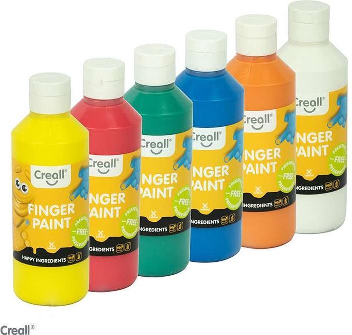 Creall vingerverf assortiment 6 x 250 ml. in de kleuren: rood, geel, blauw, groen, zwart en wit. Dit product is conserveermiddelvrij. Vingerverf op waterbasis. 98% natuurlijk grondstoffen, goede dekkracht. Waterverdunbaar. voeldoet aan de Europese veiligheidsnorm EN 71-7. Extra beveiligd met bitterstof. Makkelijk verwerkbaar voor de allerkleinsten. Droogt mat op. Kleuren onderling mengbaar.