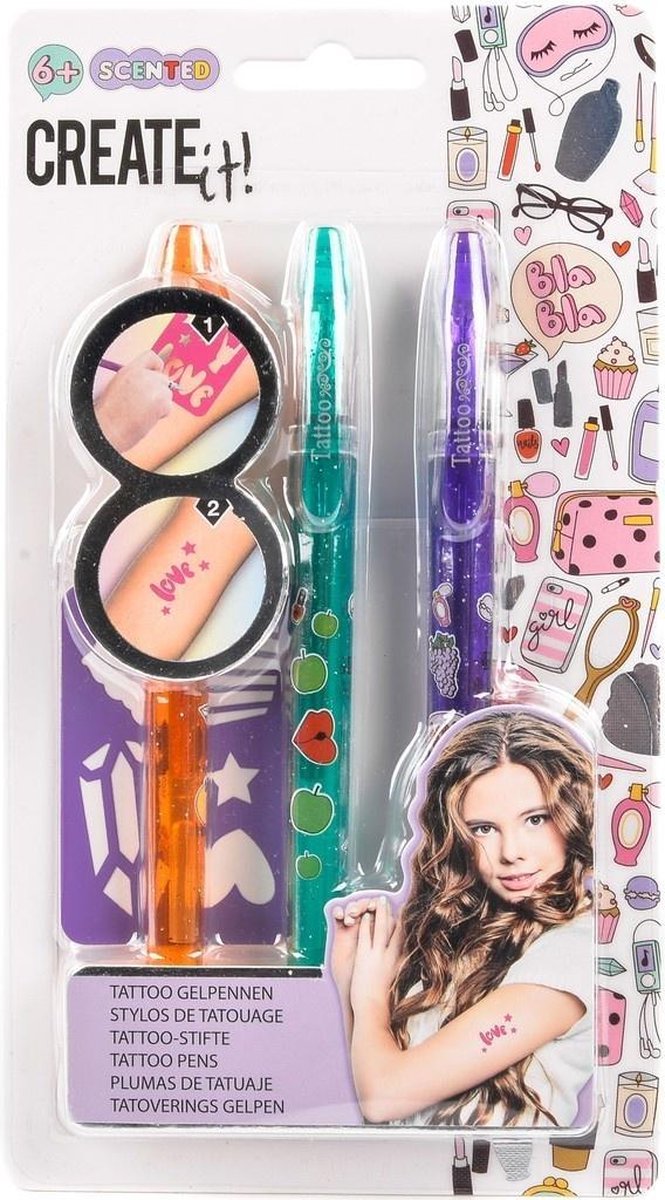 Create It! Tattoo gelpennen Maak de mooiste tatoeages met deze speciale gelpennen en een bijgeleverd sjabloon! Dankzij de verschillende kleuren kun je eindeloos combineren. En het leuke van deze pennen is dat de tatoo er na een paar dagen weer afgewassen kan worden. Leef je uit met deze heerlijk ruikende gelpennen. Specificaties: Kleur: oranje, groen, paars Materiaal: kunststof Geslacht: junior Lengte pen: 15 cm Afmetingen verpakking: 20 x 8 cm (LxB) Leeftijd: vanaf 6 jaar Inhoud: 3 Gelpennen 1 Sjabloon