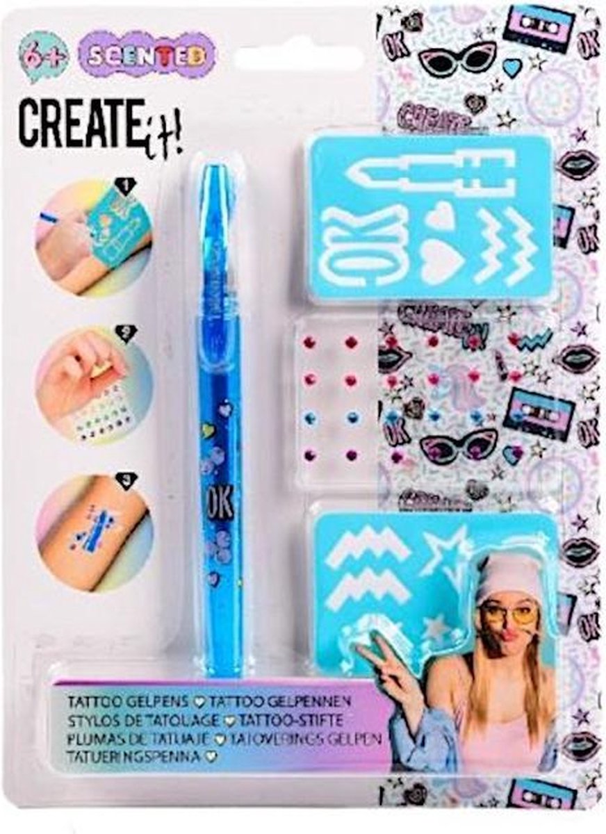 Create It! tatoeagestift Maak zelf de mooiste tatoeages met deze speciale geurende gelstift van Create It! Kleur de malletjes in en versier jouw tatoeages met diamantjes. Specificaties: Geslacht: junior Kleur: blauw Materiaal: gel Lengte: 20 cm Leeftijd: vanaf 6 jaar