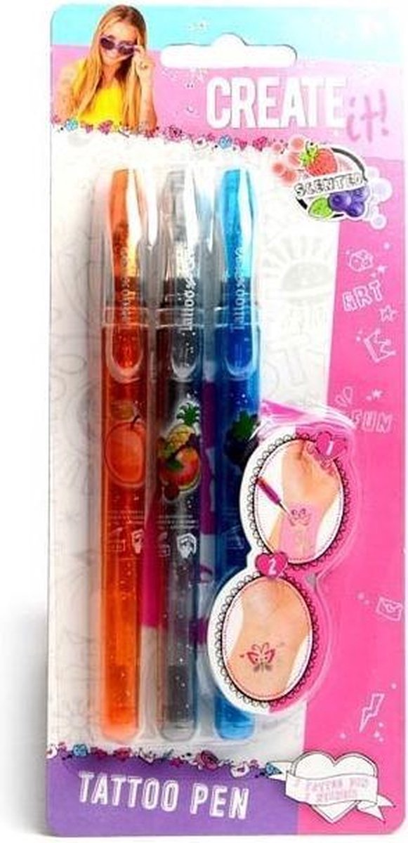 Create It! tattoo geurpen Maak zelf de mooiste tatoeages met deze speciale geurende gelpennen! Specificaties: Kleur: oranje/grijs/blauw Materiaal: kunststof Geslacht: meisjes Afmetingen verpakking: 13 x 20 x 1 cm Geschikt voor kinderen vanaf 6 jaar. Inhoud: 3 Geurpennen 1 Tekenvormpje