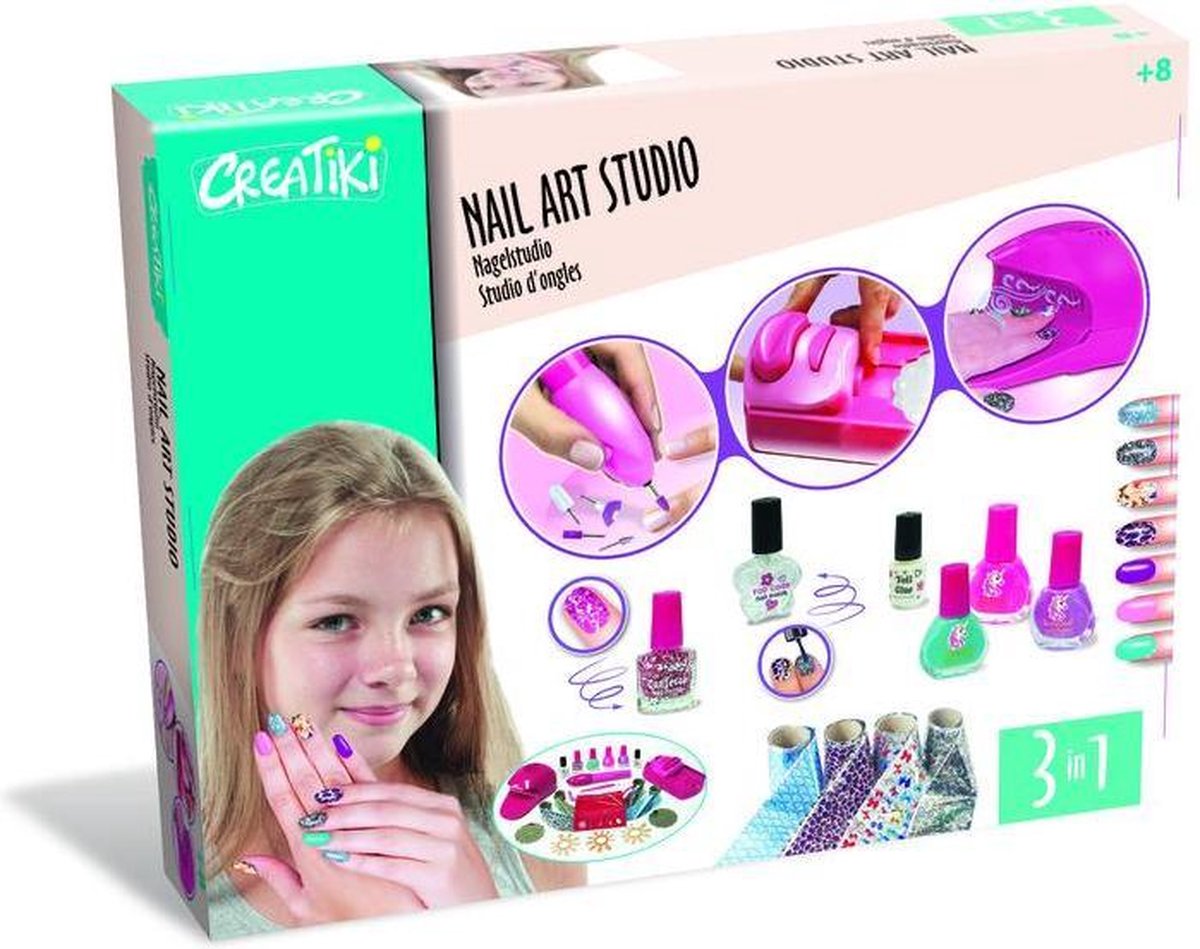 Creatiki 3 In 1 NagelstudioDeze nagelstudio voor kinderen van Creatiki is precies wat elk dametje in de dop zich maar kan wensen. Geef jezelf of je vriendinnetjes eerst een weldadige manicure met de meegeleverde nagelfrees. Vervolgens kun je de nageltjes van top tot teen versieren door er glimmende folie op te plakken, stempeltjes op te zetten of met gekleurde nagellakjes aan de slag te gaan. En last but not least leg je de nageltjes te drogen onder de echt werkende nageldroger, zodat je snel weer verder kan met spelen.