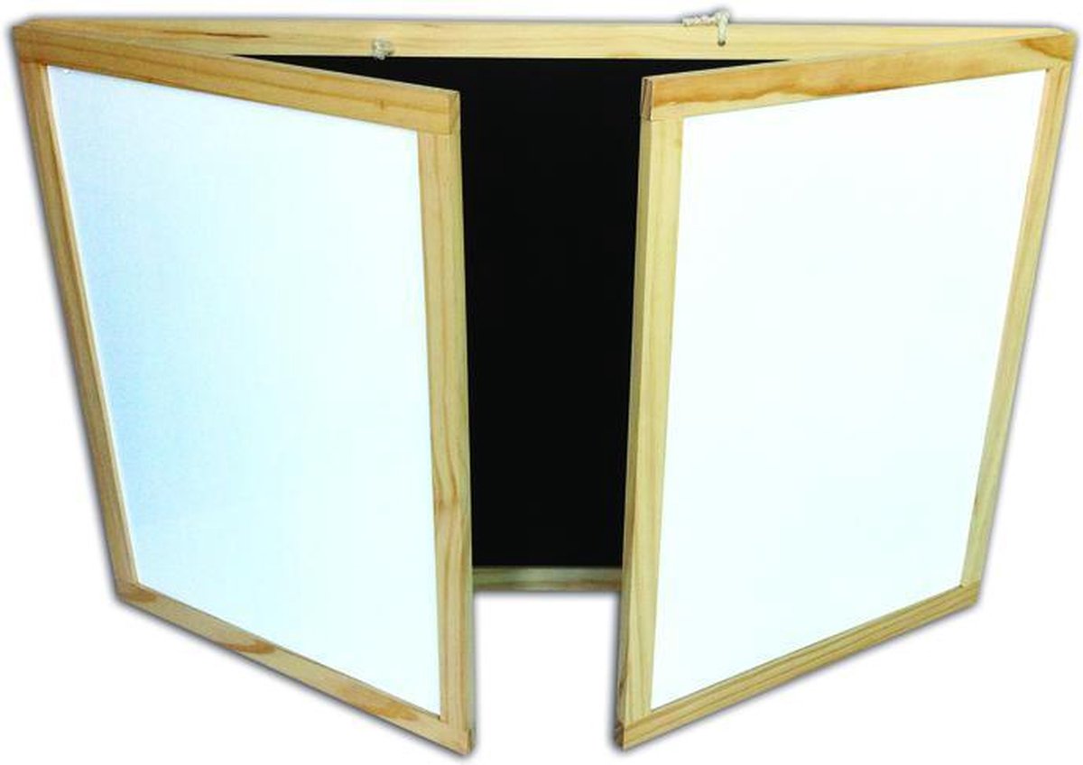 Creatiki Dubbelzijdig Toeklapbaar Schoolbord (Magnetisch) Multi-inzetbaar tekenbord dat bestaat uit 3 krijtpanelen en 2 whiteboard* panelen wanneer ingeklapt. Het bord is voorzien van een hengsel waarmee je het ophangt Bakje waarop je je krijt als markeerstiften plaatst Whiteboard is magnetisch, krijtzijde niet Open: 146 x 54 cm Dicht: 73 x 54 cm