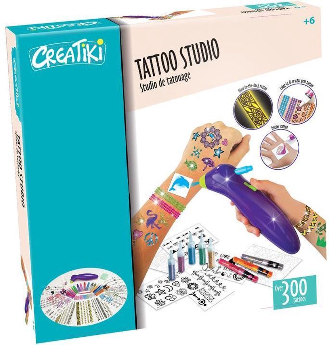 Creatiki Tattoo Studio Met de Tattoo studio van Creatiki laat je je creativiteit de vrije loop! Met de bijgeleverde airbrush kun je kleurrijke stenciltattoos maken, je hebt zelfs keuze uit 40 verschillende ontwerpen. Daarnaast kan je aan de slag gaan met meer dan 700 sprankelende kleefjuwelen, tien tattoostiften, glitter in zeven kleuren of zelfs je eigen glow-in-the-dark tattoo... De mogelijkheden zijn eindeloos! De set bevat: Airbrush op batterijen; 6 tattoostiften; 6 inkleurbare tattoobladen en 3 glow-in-the-dark tattoobladen; 200 zelfklevende stencils voor tattoos in 40 vormen; 7 soorten glitter in verschillende kleuren; 780 gekleurde kristallen kleefjuweeltjes in verschillende groottes; 4 metallieke glittertattoostiften. Geschikt voor kinderen ouder dan zes jaar. Makkelijk afwasbaar.