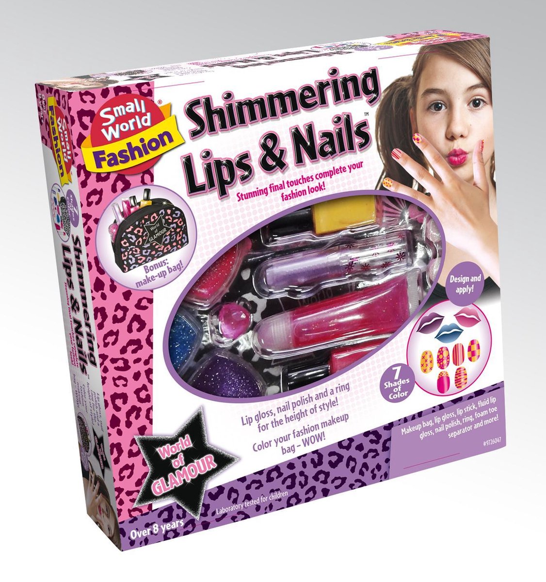 Stijlvolle jonge vrouwen weten dat een outfit pas af is met mooi verzorgde nagels en lippen. Elke nieuwe modetrend wordt ook altijd weerspiegeld in de handen en lippen van een bekend persoon. Nu kan jij ook zelf gemakkelijk trendy nagelpatronen ontwerpen! De lip gloss in deze set is speciaal ontwikkeld voor jonge, stijlvolle meisjes en is geschikt voor hun huidtype. Inhoud 2 flesjes nagellak (elk 6,8 ml), 3 kleuren lip gloss in hartvormige potjes ( elk 1,98 gr), 1 lippenstift (2,83 gr), 1 tube met vloeibare lip gloss (11,36 gr), 1 vingerscheider, 1 ring, 1 tandenstoker, 1 make-up tas die je zelf kan inkleuren (16x11 cm), 2 speciale textielmarkers.