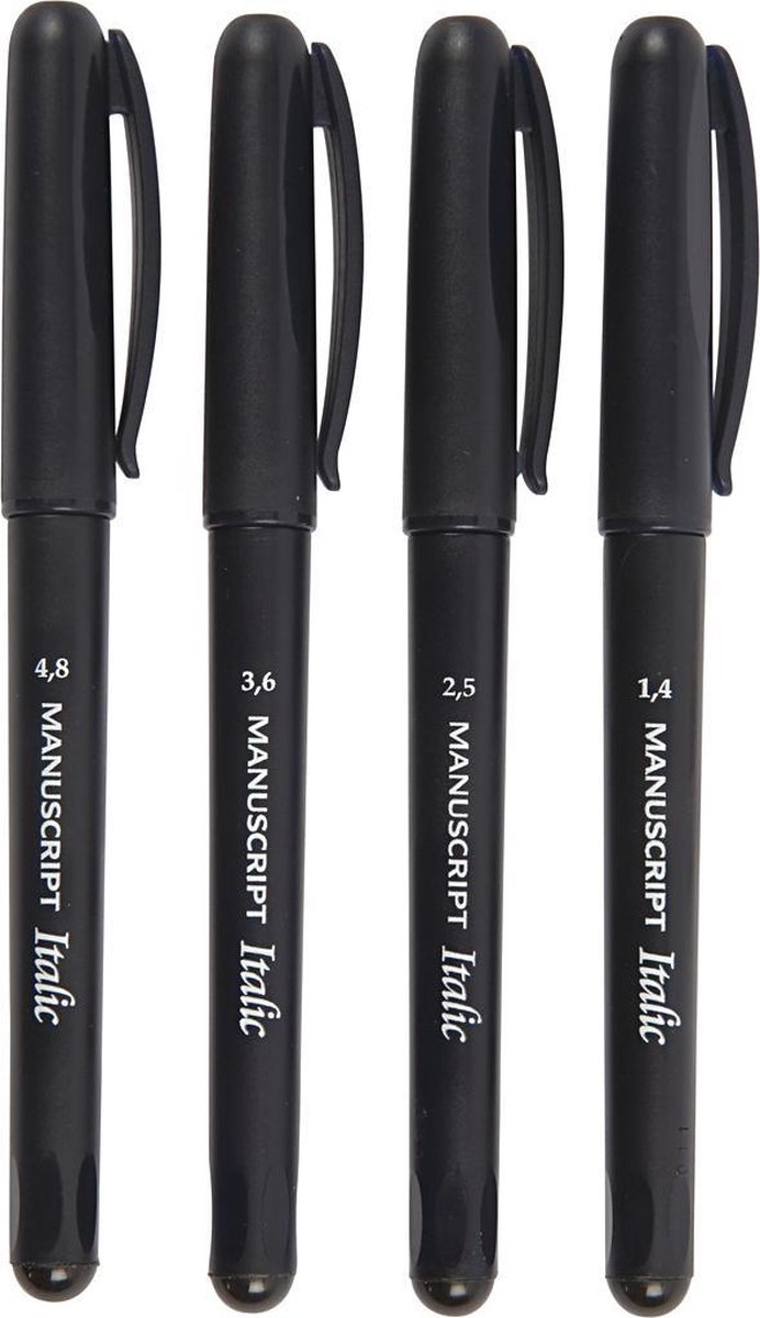Creotime kalligrafeerstiften Met deze kwalitatieve stiften maak jij de mooiste kalligrafeerkunstwerken. De vier stiften hebben ieder een andere dikte en kan je dus voor verschillende doeleinden gebruiken. De stiften kan je makkelijk uitwassen als je per ongeluk op je kleding hebt getekend. Specificaties: Geslacht: unisex Kleur: zwart Materiaal: kunststof Dikte stiften: 1,4 mm, 2,5 mm, 3,6 mm, 4,8 mm Leeftijd: vanaf 12 jaar Inhoud: 4 Verschillende dikten stiften