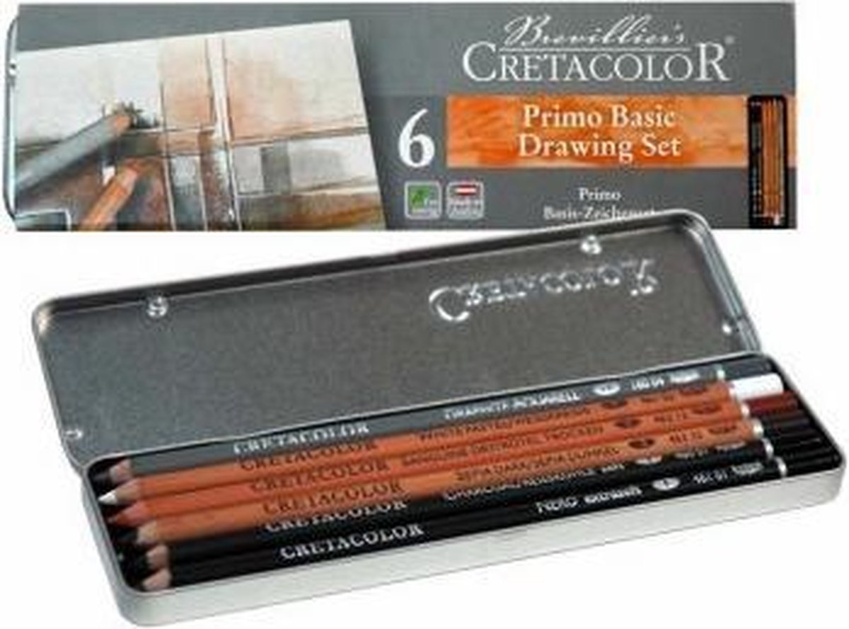 6-Delige basis tekenset in metalen box met grafiet aquarelpotlood 4B, wit krijtpotlood, sanguine dry, sepia donker, houtskoolpotlood zwart en nero potlood extrasoft