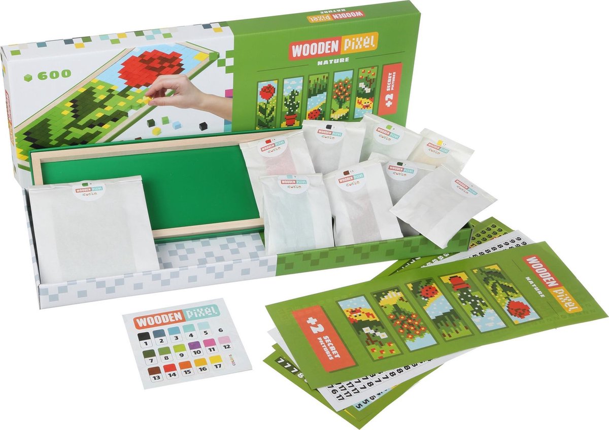 Met deze houten mozaïekset kun je allerlei verschillende afbeeldingen maken. In de doos zitten 7 voorbeelden van afbeeldingen met als thema 'natuur'. Vijf afbeeldingen zijn meteen zichtbaar, de andere twee afbeeldingen worden pas duidelijk wanneer je de instructies gevolgd hebt en de blokjes op de juiste manier in het houten frame liggen. Inhoud van de set: 600 gekleurde houten blokjes, een blank houten frame en een gekleurd kartonnen frame.Geschikt voor kinderen vanaf 6 jaar.Afmetingen: 38 cm x 1 cm x 14 cm