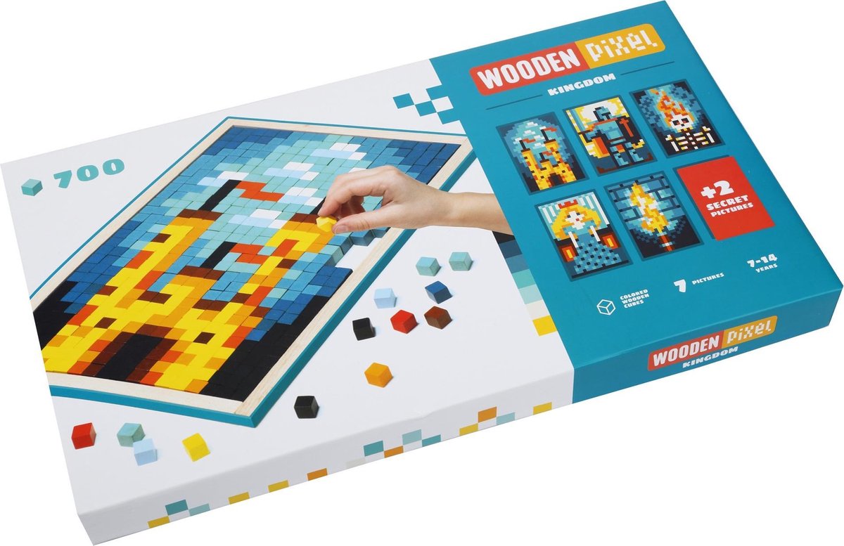 Met deze houten mozaïekset kun je allerlei verschillende afbeeldingen maken. In de doos zitten 7 voorbeelden van afbeeldingen met als thema 'ridders'. Vijf afbeeldingen zijn meteen zichtbaar, de andere twee afbeeldingen worden pas duidelijk wanneer je de instructies gevolgd hebt en de blokjes op de juiste manier in het houten frame liggen. Inhoud van de set: 700 gekleurde houten blokjes, een blank houten frame en een gekleurd kartonnen frame. Geschikt voor kinderen vanaf 7 jaar. Afmetingen: 30 cm x 1 cm x 20 cm