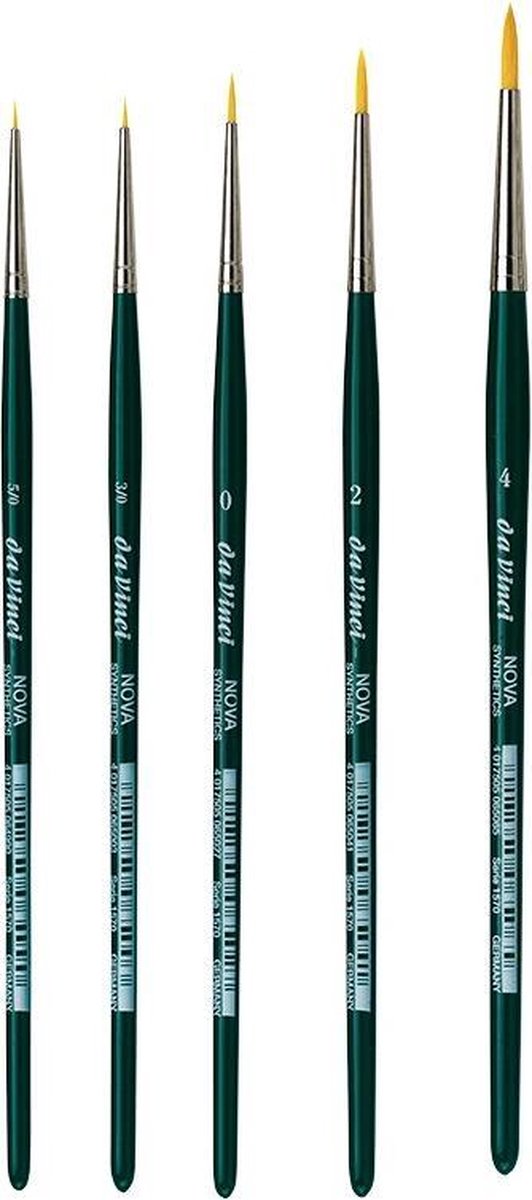 Deze Da Vinci penselen zijn geschik voor aquarel- en acrylverf. Ze worden ook vaak voor kleine details gebruikt bij modelbouw. De set bestaat uit 5 penselen nummer: -5, -3, 0, 2 en 4 Het artikel was tijdelijk niet op voorraad, maar nu weer voldoende voorraad binnen.