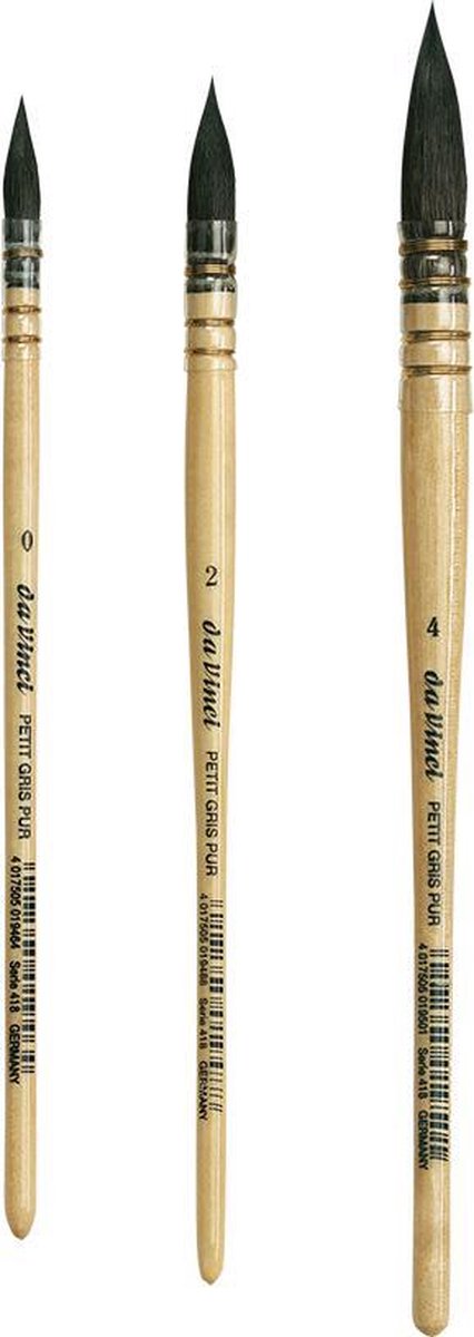 Frans aquarel verwaspenseel van Da Vinci met zuiver blauw Russisch/Canadees eekhoornhaar, ook bekend onder de naam Petit gris. Het eekhoornhaar heeft een extreem hoog verf- en wateropnemend vermogen, er kan lang worden doorgeschilderd. Zeer geschikt voor lavis, verwassingen en grote vlakken in aquarel en inkt. Ook geschikt voor het schilderen van letters, zijde schilderen en kalligrafie. Korte houten, blank gelakte steel, de lange haren zijn tot maat 10 rond gezet in een naadloze kunststof bus, maat 12 heeft een huls van een ganzenveer omwonden met koperdraad. Set van 3 penselen serie 418 nr : 0-2-4