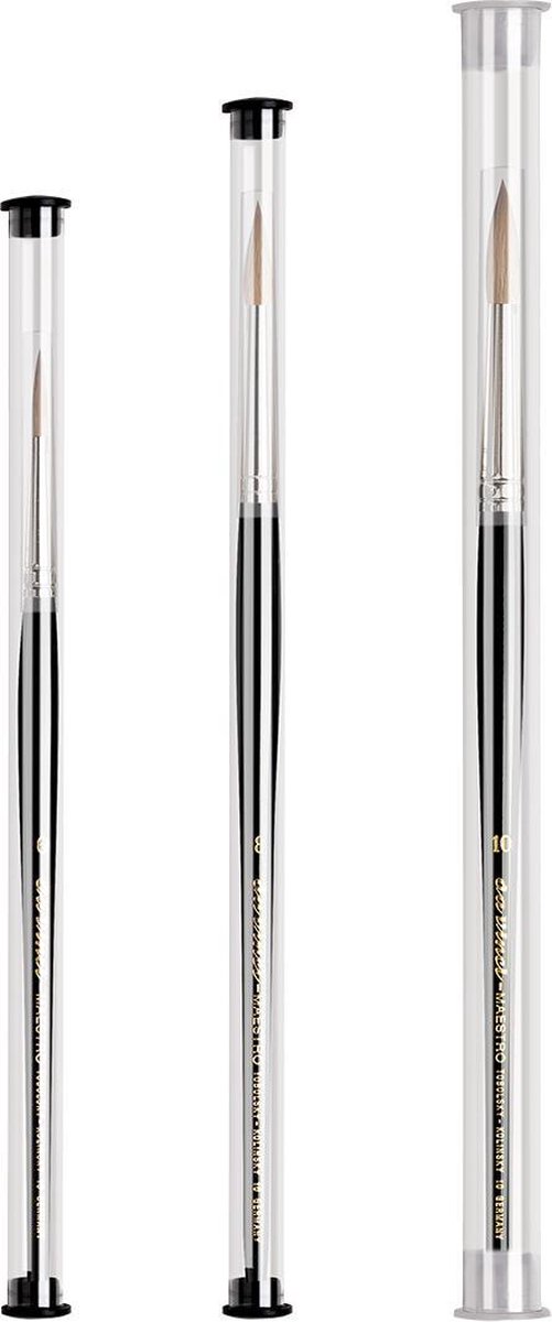 Marter Kolinsky. Techniek: Aquarel Kolinsky Tobolsky Vorm: Punt Huls: naadloos, messing vernikkeld. Steel: korte steel, messing vernikkeld. In koker. Set van 3 penselen, maten 6, 8 en 10