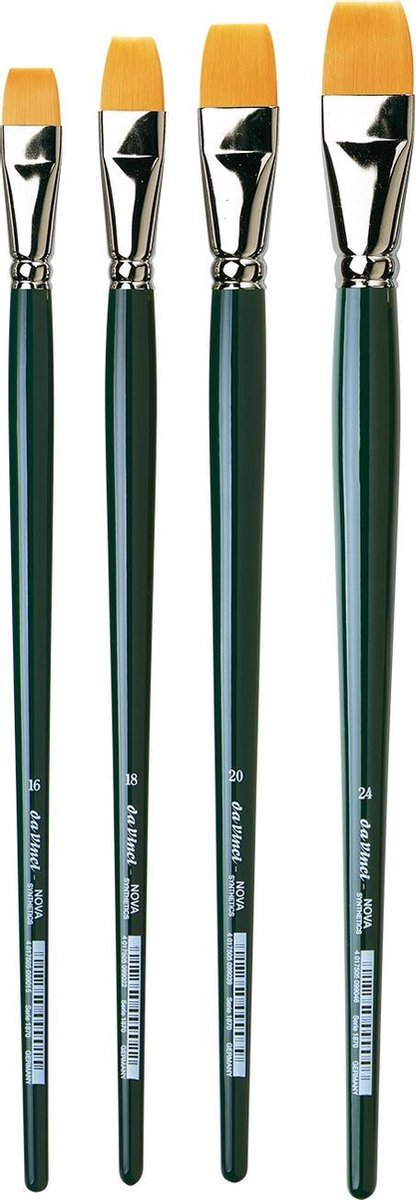 Techniek: Olie/acryl Haar: Nova filament Vorm: Plat Huls: Naadloos messing vernikkeld Steel: Lange steel set van 4 penselen: 16-18-20-24