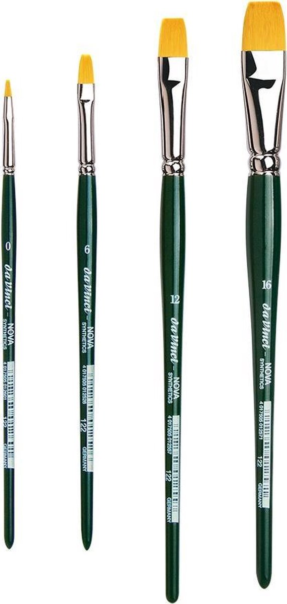 Techniek: Olie/acryl Haar: Nova filament Vorm: Plat Huls: Naadloos messing vernikkeld Steel: Lange steel set van 4 penselen: 2-6-12-16