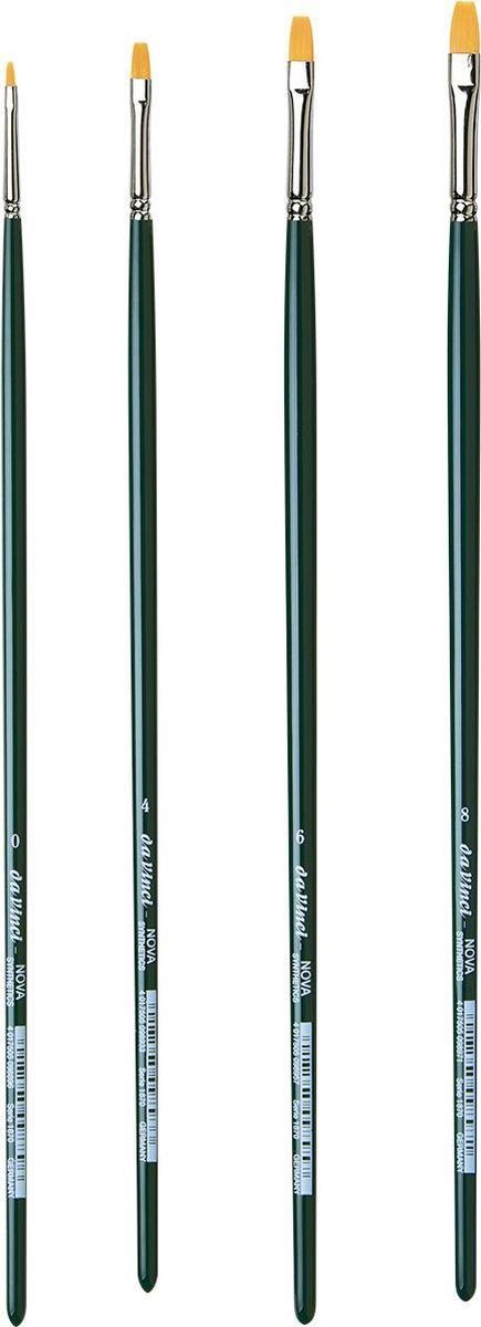 Techniek: Olie/acryl Haar: Nova filament Vorm: Plat Huls: Naadloos messing vernikkeld Steel: Lange steel Set van 4 penselen, maten: 0, 4, 6 en 8