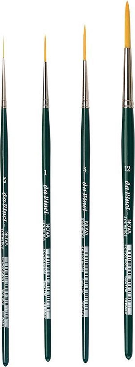 Techniek: Olie/acryl Haar: Nova filament Vorm: sleper Huls: Naadloos messing vernikkeld Steel: Lange steel Set van 4 penselen, maten: -5, 1, 4, 12