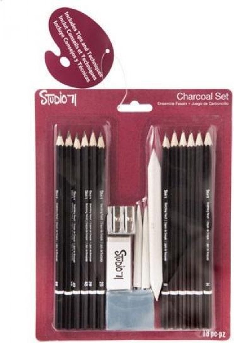 Darice • Studio 71 charcoal sketching 18 stuks Contents: 3 charcoal pencils (soft, medium, hard) 3 sketching pencils (6B,4B,2B) 3 compressed charcoal sticks (soft, medium, hard) 3 soft pastel sticks 2 stumps 1 tortillion 1 sharpener 1 kneaded eraser 1 vinyl eraser