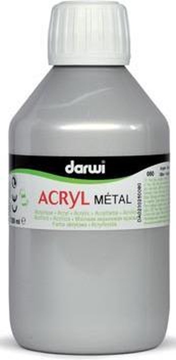 Darwi Metal effect acrylverf Kan gebruikt worden op verschillende ondergronden: hout, MDF, gips, aluminium, modelleerpasta. De verf kan aangebracht worden d.m.v. een penseel, sponsje, sjabloon, enz. Flacon van 250 ml. Kleur: zilver