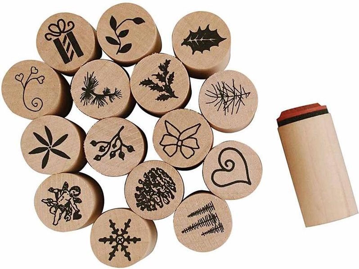 Rubber stempels op houten blok met verschillende gedetailleerde bloemen en bladeren afbeeldingen.Rubber stempels op houten blok met diverse gedetailleerde Kerst-afbeeldingen.