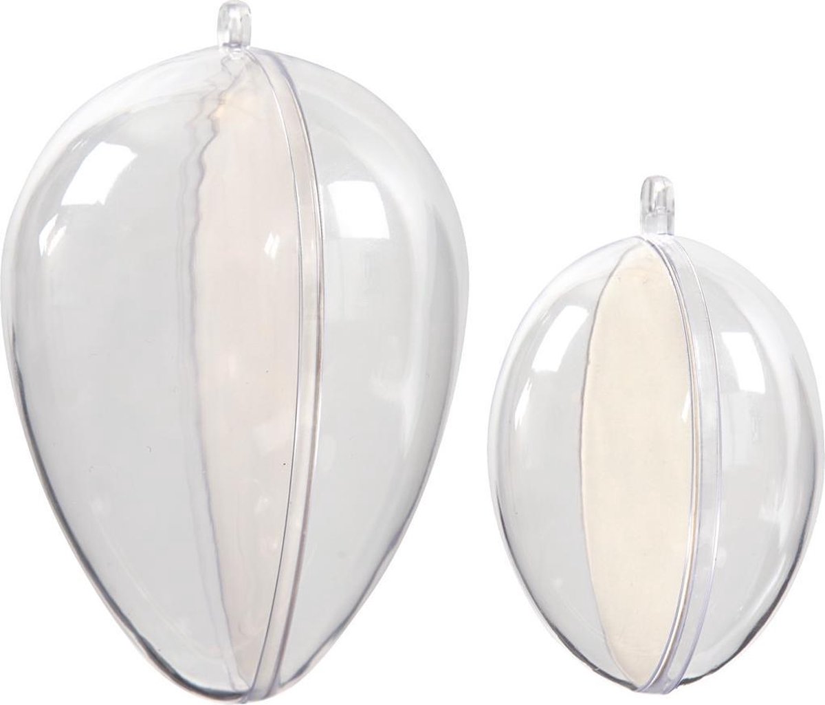 Tweedelig ei van acryl met metalen hanger en een stuk karton om te decoreren Pakket met 2 verschillende maten, 10 grote en 15 kleine eieren.Tweedelige eieren van acryl met metalen hanger en een stuk karton om te decoreren.