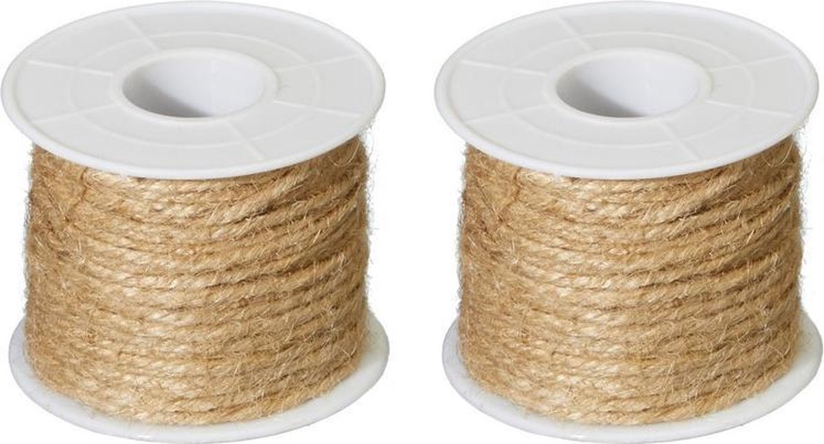 2x Hobby/decoratie jutegaren naturel rol/spoel van 20 meter. Lengte: 20 meter. Materiaal: jute. U ontvangt 2 stuks. Creatief hobby materiaal / decoratietouw. Cadeau verpakkingsmateriaal decoratie touw naturel kleur.