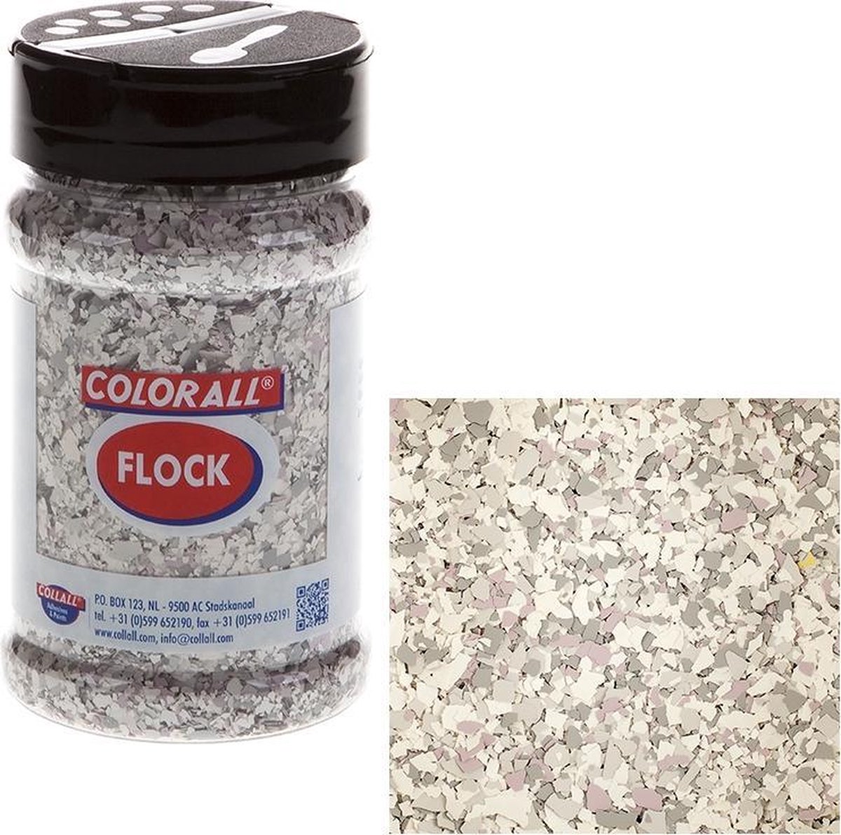 Colorall FLOCK kan op bijna iedere ondergrond aangebracht worden. Het is zeer slijtvast en gemakkelijk te reinigen. FLOCK geeft een natuursteen effect! Breng een laag verf of Colorall Vernislijm aan. In deze nog natte verf of lijm strooit u de verfsnippers. Naarmate je van grotere hoogte strooit verdelen de verfsnippers zich gelijkmatiger (als sneeuw). De FLOCK verfsnippers kunnen met de hand vermalen worden om nog fijner te kunnen werken. Na droging voorzichtig met een schuurspons de losse delen wegschuren. Hierna kunt u met Collall Decoupagevernis / Collall Deco Sealer het geheel afwerken. Sterk zuigende materialen een keer voorbehandelen met bijvoorbeeld Colorall Gesso. Doordat de vlokken poreus zijn zuigen ze de kleur van de verf/ lijm gedeeltelijk op. FLOCK geeft op iedere kleur verf dus steeds een ander resultaat!