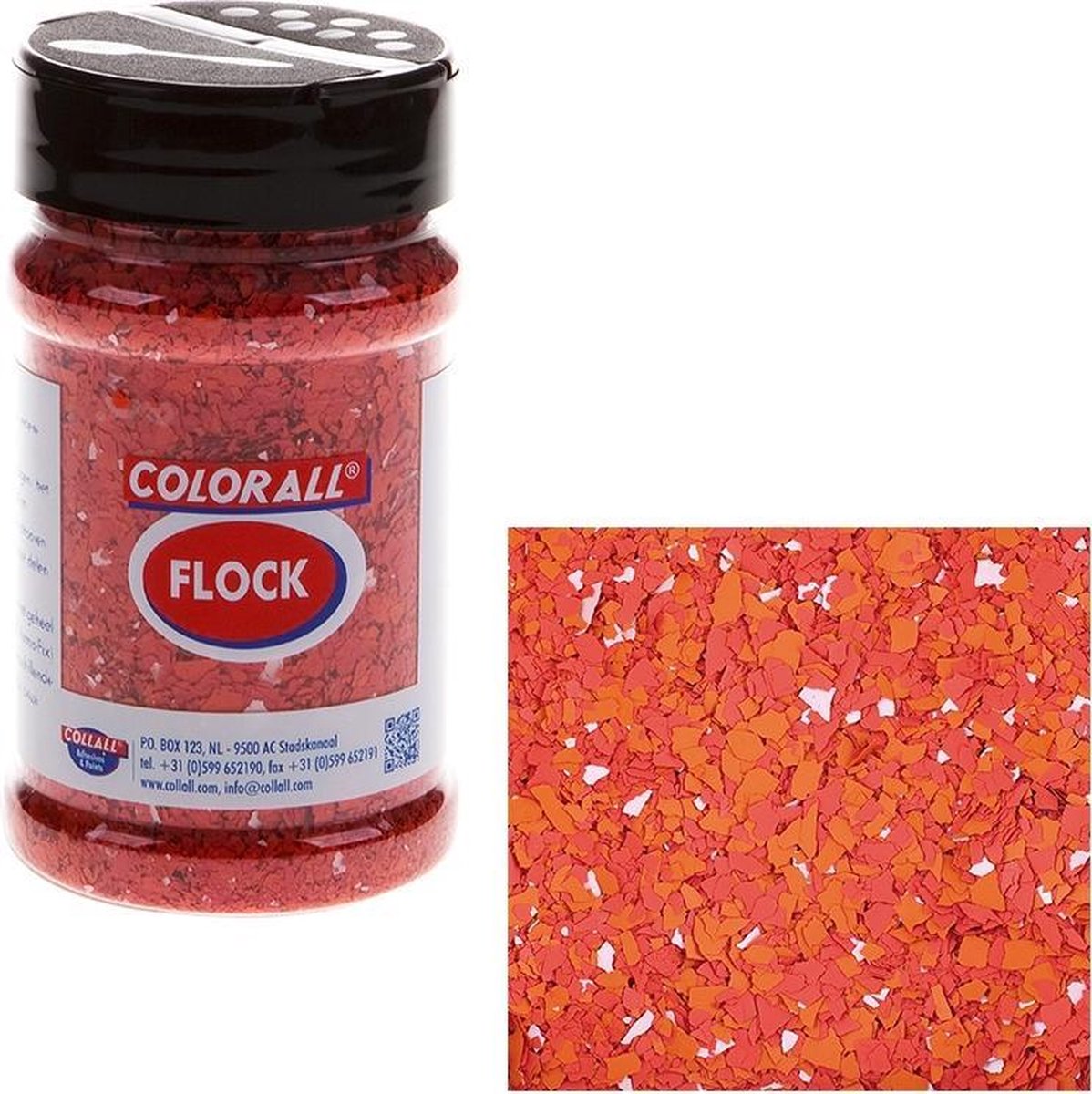 Colorall FLOCK kan op bijna iedere ondergrond aangebracht worden. Het is zeer slijtvast en gemakkelijk te reinigen. FLOCK geeft een natuursteen effect! Breng een laag verf of Colorall Vernislijm aan. In deze nog natte verf of lijm strooit u de verfsnippers. Naarmate je van grotere hoogte strooit verdelen de verfsnippers zich gelijkmatiger (als sneeuw). De FLOCK verfsnippers kunnen met de hand vermalen worden om nog fijner te kunnen werken. Na droging voorzichtig met een schuurspons de losse delen wegschuren. Hierna kunt u met Collall Decoupagevernis / Collall Deco Sealer het geheel afwerken. Sterk zuigende materialen een keer voorbehandelen met bijvoorbeeld Colorall Gesso. Doordat de vlokken poreus zijn zuigen ze de kleur van de verf/ lijm gedeeltelijk op. FLOCK geeft op iedere kleur verf dus steeds een ander resultaat!