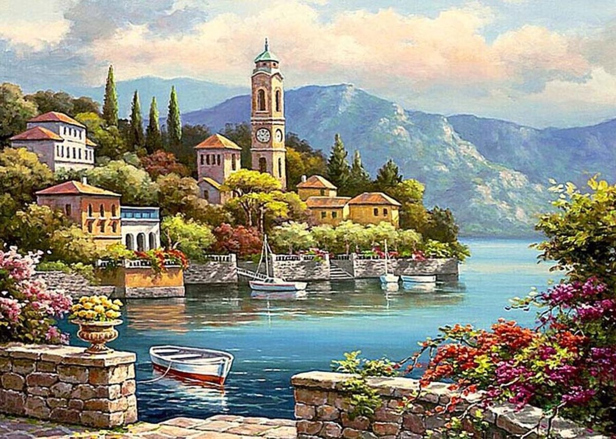 Delki® Landschap Dorp Aan Het Meer Schilderen Op Nummer Volwassenen - 40x50 - Houten Penselen - Met Frame