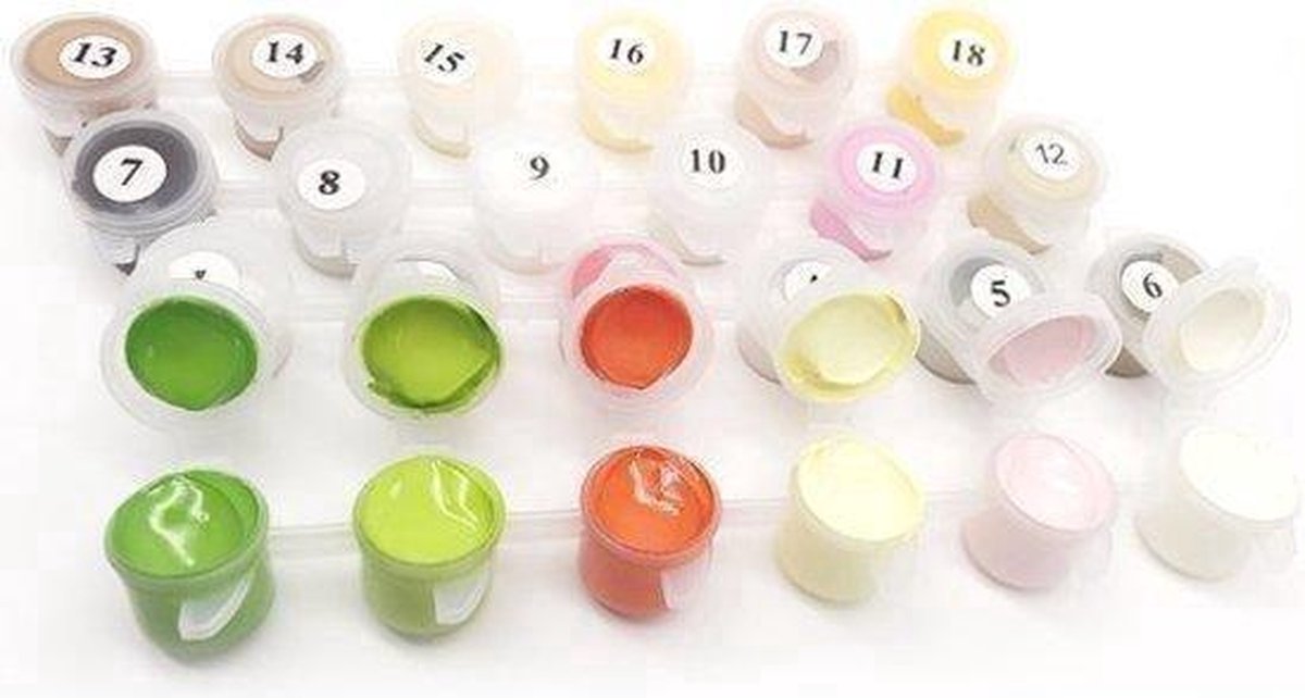 Heb je altijd al een eigen schilderij aan de muur willen hebben? Of ben je op zoek naar ontspanning? Probeer dan eens onze schilderen-op-nummer set. Paint-by-numbers is momenteel erg populair. Het werkt rustgevend en je hebt ook nog eens een mooi eindresultaat! In plaats van de hele avond voor de TV te hangen, kun je nu in alle rust creatief bezig zijn. Hoe werkt schilderen-op-nummer? Bij schilderen-op-nummer is het ontwerp als een kleurplaat geprint op een canvasdoek. In elk vakje staat een nummer. Elk nummer in een vakje komt overeen met een nummer op een verfpotje. Schilder de vakjes één voor één met de juiste kleur verf. Mengen van verf is dus niet nodig. Op deze manier maak je stap voor stap je eigen meesterwerk! Wat bevat een schilderen-op-nummer-set van Delki? Deze set bevat het volgende: ?Genummerd canvasdoek ?Genummerde potjes acrylverf ?Houten Penselen set van 3 ?A3 Voorbeeld ?Gekleurde mini-voorbeeld ?Inclusief frame Specificaties: ? Materiaal: katoenen doek, houten