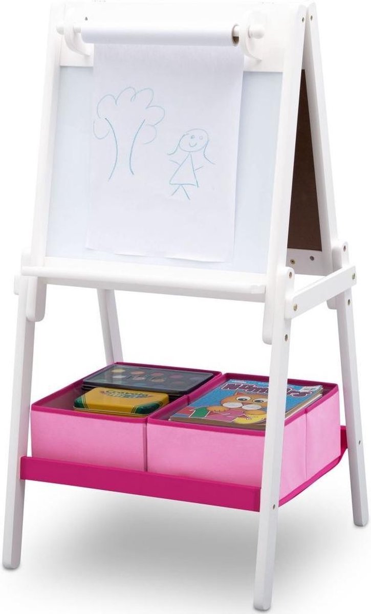 Dubbelzijdig houten schoolbord met opbergmanden in wit/roze kleurstelling. De ene kant is een zwart krijtbord en de andere kant is een wit magnetisch bord met een papierrol. Het witte bordkan beschrevenworden met een speciale white board stift en weer eenvoudig gewist worden. Inclusief papierrol. Materiaal MDF Materiaal opbergbakken stof Met papierrol In wit/roze kleurstelling Afmeting ca. LxBxH 56 x 54 x 102 cm Gewicht 8,3 kg Geschikt voor kinderen vanaf 2 jaar