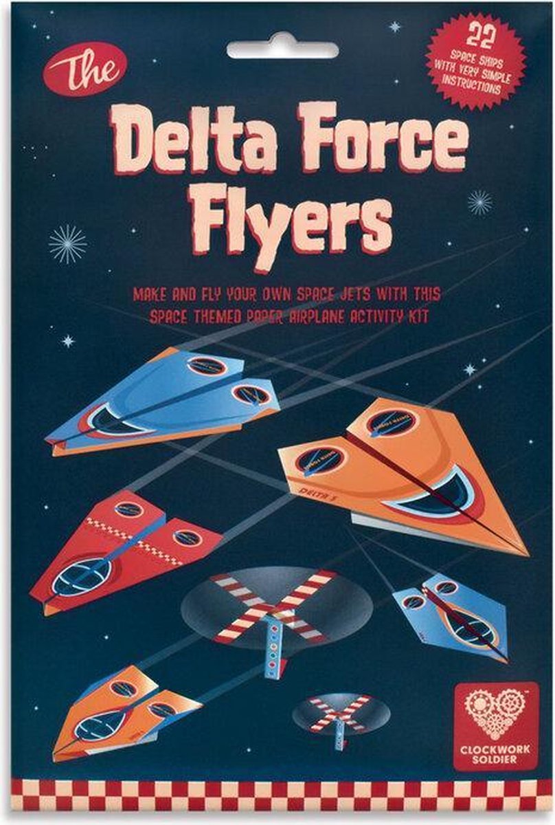 THE DELTA FORCE FLYERS A create your own paper spacecraft kit which includes a fun activity booklet. Make and fold 20 delta flyers with 5 different designs and see how far you can fly them! No glue or scissors needed Contents: 20x space jet sheets, 2x helicopter spy drones, 1x 8 page full colour booklet Made from FSC certified recycled paper Age 5+