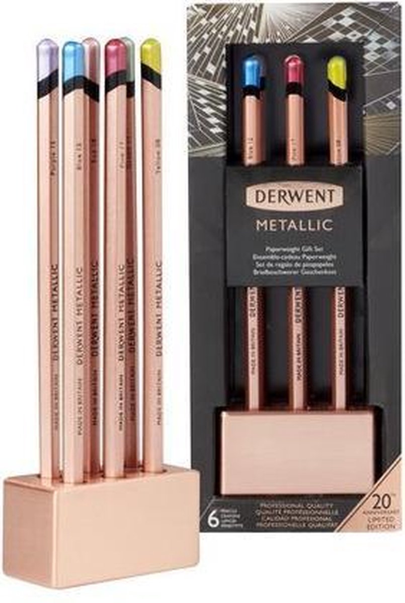 Na twee decennia van opvallend design en generaties van Derwent, is de nieuwe metallic-reeks gerestyled en uitgebreid - met artiesten van alle leeftijden die naar verwachting een glans zullen geven aan de veelzijdigheid en glans van de reeks. Een geweldig cadeau voor de artiest in je leven. Deze limited edition set wordt compleet geleverd met 6 Derwent Metallic Pencils en een stijlvolle verkoperde houder. De houder is afgewerkt met een mooie satijnachtige uitstraling en biedt plaats aan 6 van je favoriete potloden. Derwent Metallic potloden zijn glanzende, zeer metallic potloden die prachtig in elkaar overvloeien om levendige en opvallende metallic effecten te creëren, vooral op donker papier. Bevat: 6 Derwent Metallic potloden, 1 verkoperde presse-papier Geschenkset voor 20e verjaardag in beperkte oplage Dubbelzijdige verkoperde houder voor 6 potloden Nieuwe, niet-oplosbare, glinsterende, zeer metaalachtige potloden ontworpen om een ??maximaal effect te creëren Artist kwaliteit,