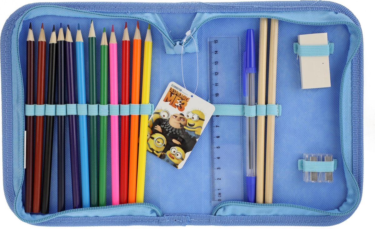 Creativiteit is belangrijk voor de sociaal emotionele ontwikkeling van uw kind. Uw kind zal eindeloos genieten van de tekenset van de superpopulaire film Despicable me. De tekenset bestaat uit 12 kleurpotloden, 2 normale potloden, een pen, een punteslijper, een lineaal, en een gum. U kunt het etui gemakkelijk meenemen onderweg, zodat uw kind altijd kan tekenen. Voordelen: ? Handige meeneemetui ? Inclusief punteslijper, lineaal en gum ? Stumuleert creatieve ontwikkeling bij uw kind ? Inclusief BH potlood met punteslijper ? Gemakkelijk weer op te bergen dankzij de handige verpakking Specificaties: - Materiaal: Polyester, Karton, Hout, Plastic - Gewicht: 224 gram - Kleur: Blauw, Geel Inhoud: 1x Despicable Me Minion Tekenset met Potloden, Pen, Lineaal Punteslijper en Gum Despicable Me Minion Tekenset met Potloden, Pen, Lineaal Punteslijper en Gum – 22x15x4cm | Tekenset in Handig Meeneem Etui | Tekenen en ontdekken voor Kinderen | Despicable Me