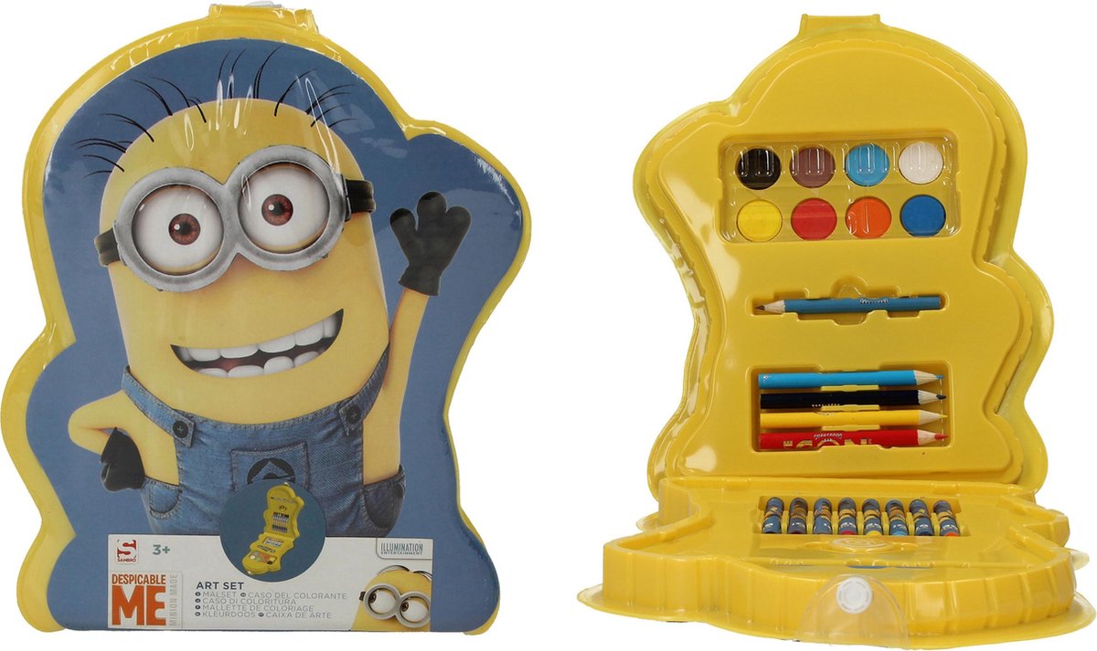De minions gaan met je kleuren! De Despicable me Art set is uitgerust met een grijs potlood, kleurpotloden, krijtjes, een punteslijper, een kwast en verf. Wordt creatief met de kleurset en maak de mooiste tekeningen en kleurplaten. Voordelen: ? Makkelijk om mee te nemen onderweg ? Makkelijk op te bergen door de handige opbergdoos. ? De verf droogt niet uit en is zo gemakkelijk weer opnieuw te gebruiken. Specificaties: - Materiaal: Plastic, Karton, Acrylverf, Krijt en Potlood Inhoud: 1x Despicable me Art set Despicable Me Minions Knutsel en Tekenset voor Kinderen – 19 x 24 cm | Verschrikkelijke Ikke Hobbypakket voor Kleuren en Verfen