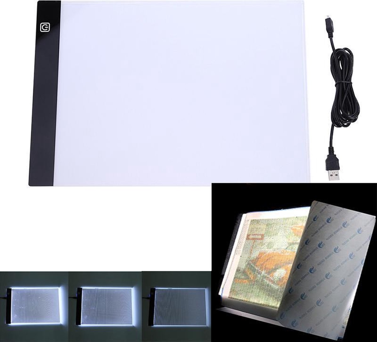 Diamond Painting Lightpad met CE keurmerk. Deze Lightpad is te gebruiken voor tekenen en diamond painten. Het is makkelijk om de symbolen, cijfers en tekens te zien. Dit komt omdat er LED licht in zit. Deze lightpad is dimbaar en heeft dan ook 3 verschillende standen. Voor 's avonds en evt. ook te gebruiken bij daglicht. Dit is een echte aanrader voor de diamond painter.