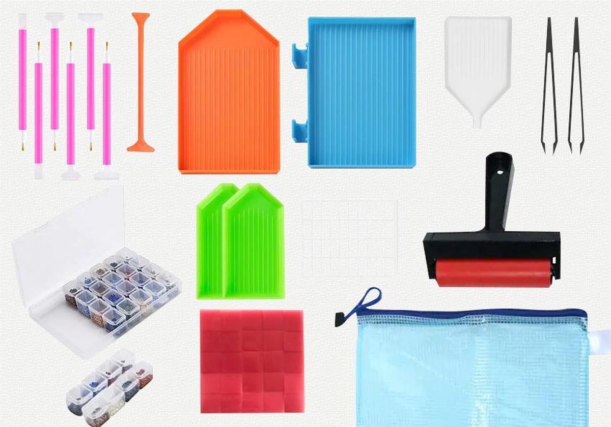Daimond Painting accesoires pakket. Sorteer met gemak steentjes in de uitgebreide opbergdoos met 28 vakjes. Deze luxe Daimond Painting Set is alles wat je nodig hebt! Met nu nog meer accessories om de mooiste tekeningen te maken en meer plezier uit je hobby te halen. Ook gemakkelijk te gebruiken voor kinderen. 28 vakjes opbergdoos Wil je geen énkel steentje meer verliezen? Sorteer al je steentjes nu met de 28 vakjes opbergdoos. Kies de juiste kleur en zorg voor overzicht tijdens het uitvoeren van jouw favoriete hobby. Je hebt maar liefst 28 vakjes waardoor je genoeg ruimte heb voor al je steentjes en er geen kleur meer kan onntbreken. Diamond painting roller De diamond painting roller is gemakkelijk en ideaal te gebruiken voor het aandrukken van de diamantensteentjes, Door de painting roller te gebruiken heeft u geen last meer van springende steentjes. Na een paar keer rollen blijven de steentjes stevig aan het canvas plakken en krijg je een extra glad oppervlak. 6 verschillende