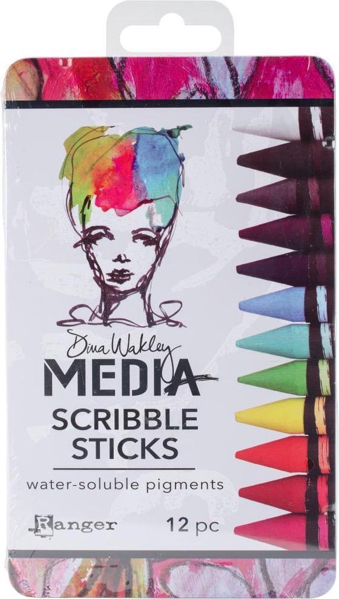 De Dina Wakley Scribble Sticks kunt u gebruiken als krijtjes maar ze zijn ook water oplosbaar waardoor u ze ook kan gebruiken om mooie watercolor achtergronden te maken. In het blik zitten 12 krijtjes in de kleuren: Magenta, Ruby, Tangerine, Lemon, Lime, Turquoise, Sky, Night, Blackberry, Umber, Black and White.