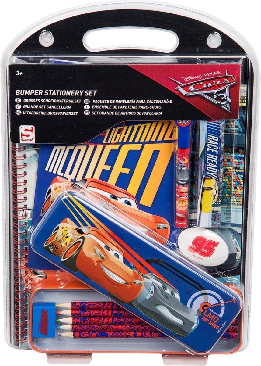 Met deze Cars 3 stationary set heb je een hele set met schoolspullen van jouw favoriete racewagen, Bliksem McQueen! De set bestaat uit verschillende schrijfmaterialen, zoals een schrijfblok, pen, potloden, liniaal, gum en puntenslijper. Al deze schrijfspulletjes hou je makkelijk bij elkaar door ze op te bergen in het pennenblikje.