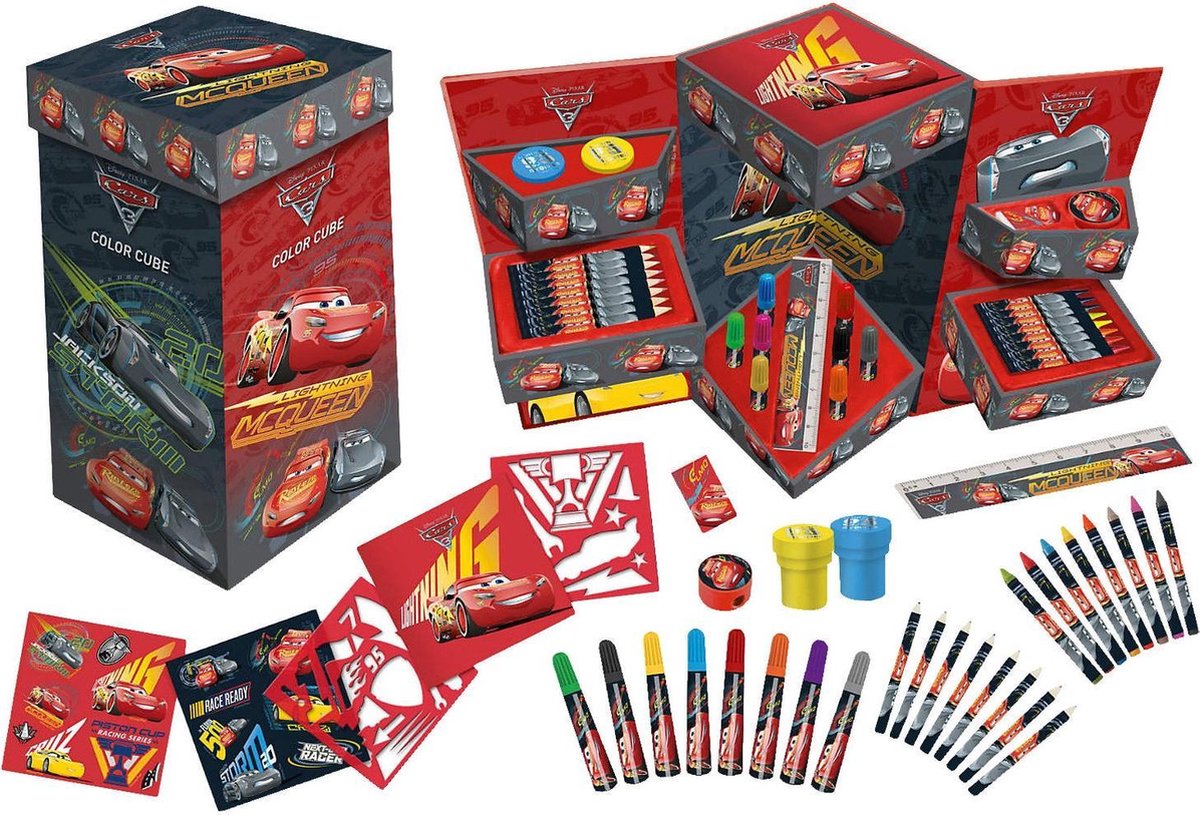Disney Cars kleurkubus Maak de mooiste en gaafste tekeningen met deze kleurkubus van Cars. Laat jouw creativiteit de vrije loop met de sjablonen, waskrijtjes en stiften. Ben je klaar? Laat het resultaat aan iedereen zien! Specificaties: Kleur: multicolor Geslacht: junior Materiaal: karton, kunststof, hout Afmetingen kubus: 24 x 11,5 x 11,5 cm (L x B x H) Leeftijd: vanaf 5 jaar Inhoud: 1 Gum 1 Puntenslijper 1 Liniaal 2 Sjablonen 2 Stickervellen 2 Stempels 8 Stiften 8 Kleurpotloden 8 Waskrijtjes