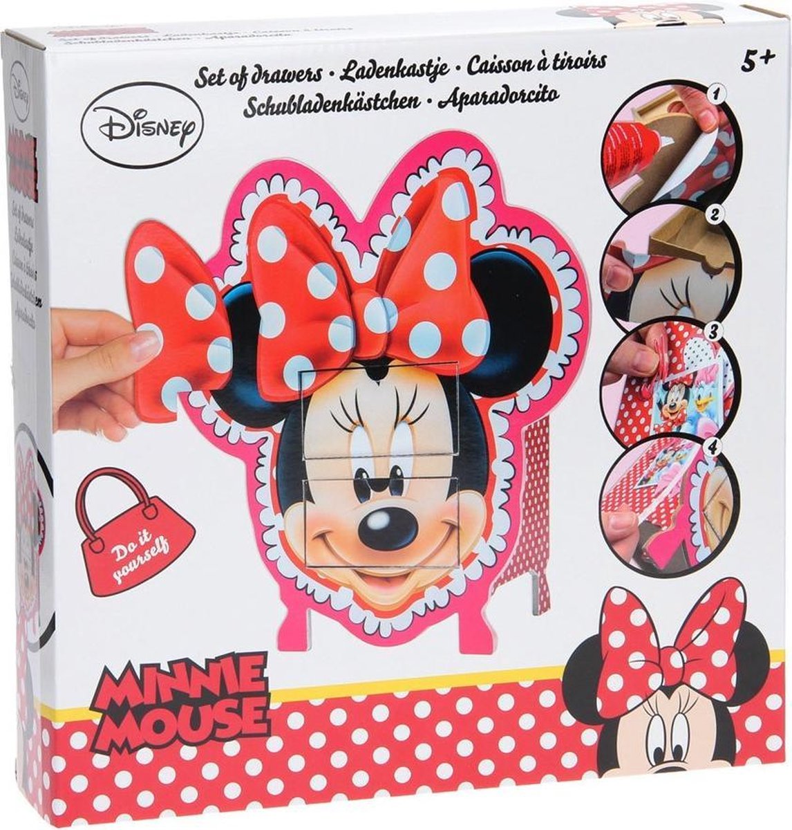Disney maak je eigen ladenkastje Minnie Mouse Als echte fan van Minnie Mouse is jouw kamer helemaal af met dit prachtige ladenkastje dat jij zelf in elkaar zet! Het kastje heeft twee lades en wordt geleverd met alle benodigdheden om hem helemaal zelf in elkaar te zetten. Specificaties: Kleur: roze Materiaal: hout Geslacht: meisjes Afmetingen: 30 x 30 x 7 cm (L x B x D) Leeftijd: vanaf 5 jaar Inhoud: 7 Houten kastonderdelen 5 Stickervellen 1 Potje witte verf 1 Kwast 2 Lades