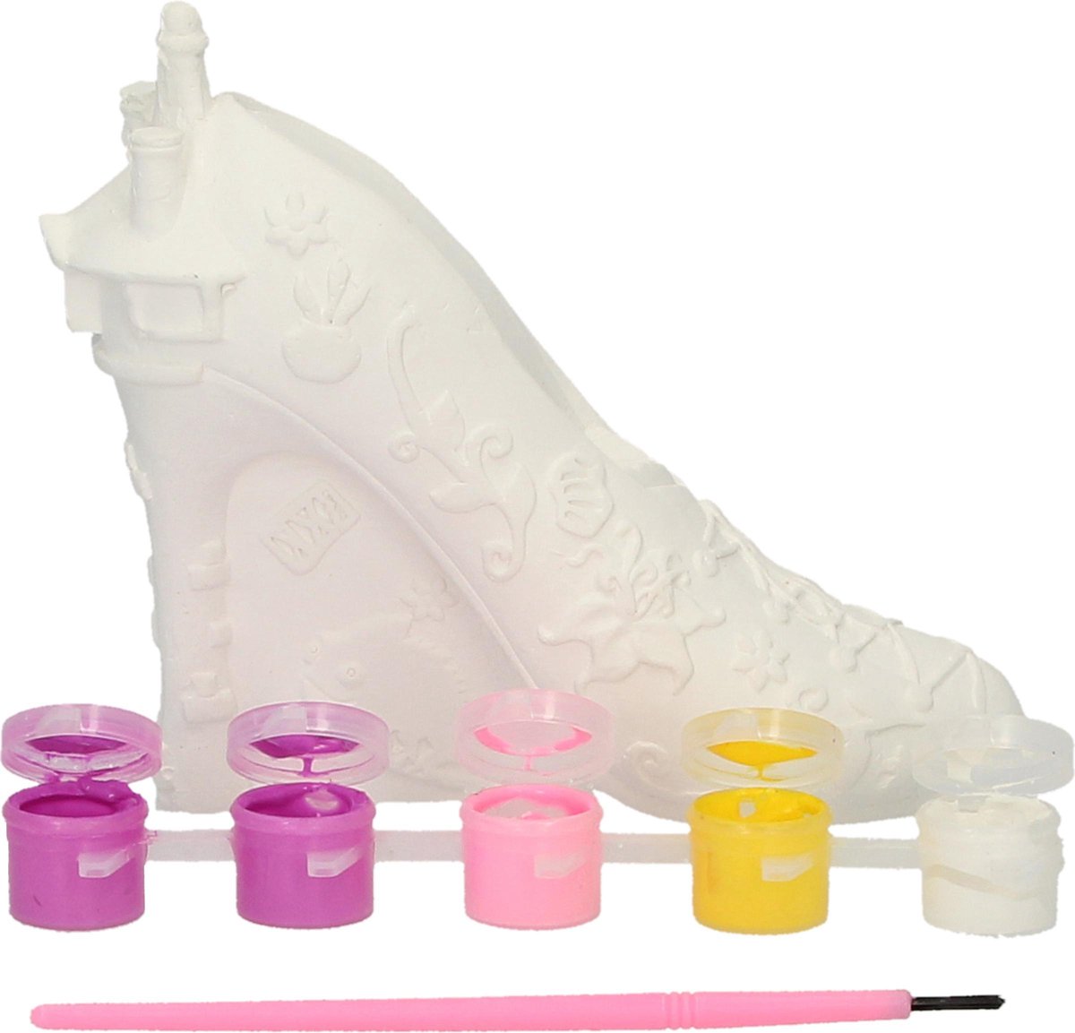 Wordt creatief en schilder je eigen Disney Prinsessenschoen. Beschilder de schoen met mooie kleuren en maak zo je eigen prachtige creatie. Je kan kleuren mengen en zo nieuwe kleuren ontdekken. Je schoen wordt zo de ultieme decoratie voor je slaapkamer. Knutselen is niet alleen leuk, maar ook leerzaam. Leer en speel en ontdek zo je eigen creativiteit. Voordelen: ? Stimuleert creativiteit bij je kind ? Leuke decoratie voor in je kamer ? Bijgevoegde verf in de kleuren paars, roze, geel en wit ? Bijgevoegde kwast ? Gedetailleerde gipsen schoen Specificaties: - Materiaal: Gips, Verf - Gewicht: 311 Gram Inhoud: 1x Disney Princess Verf je eigen Schoen Knutselpakket 13x16x4cm Disney Princess Verf Je Eigen Schoen Knutselpakket - 13x16x4cm | Schilderen voor Meisjes | Hobbypakket | Knutselen voor Kinderen