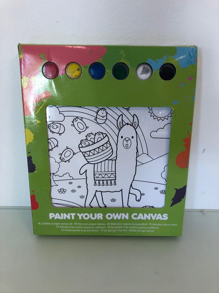 Leuk diy canvas met lama print. De verpakking bevat een canvas, een kwast en verf. De afmetingen zijn 20 x 24