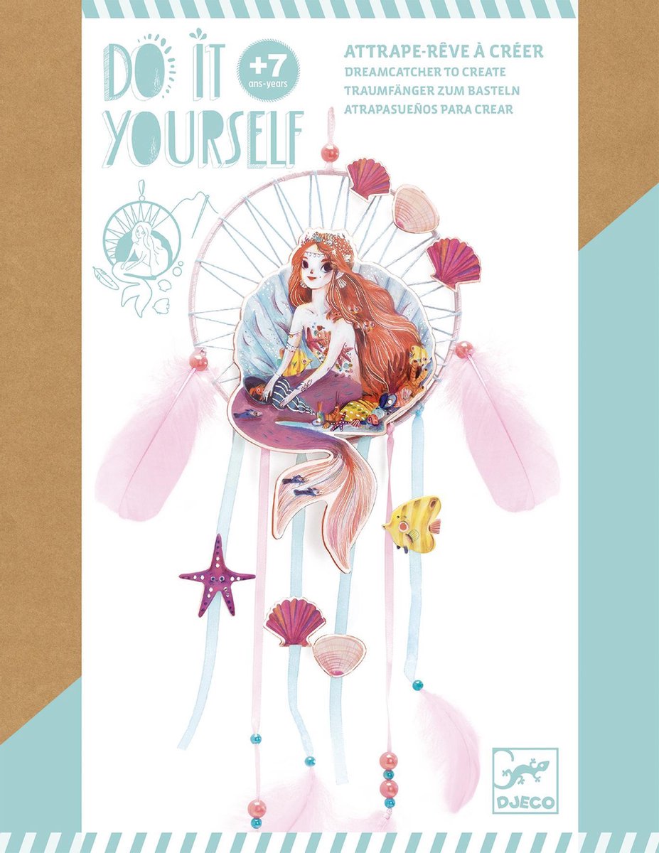 DIY dromenvanger zeemeermin Maak je eigen dromenvanger met dit knutselpakket. Vlecht eerst zelf de dromenvanger volgens de instructie en versier deze met schelpen, linten, veren, kralen en de zeemeermin. De afmeting: 15x40 cm Leeftijd: vanaf 7 jaar