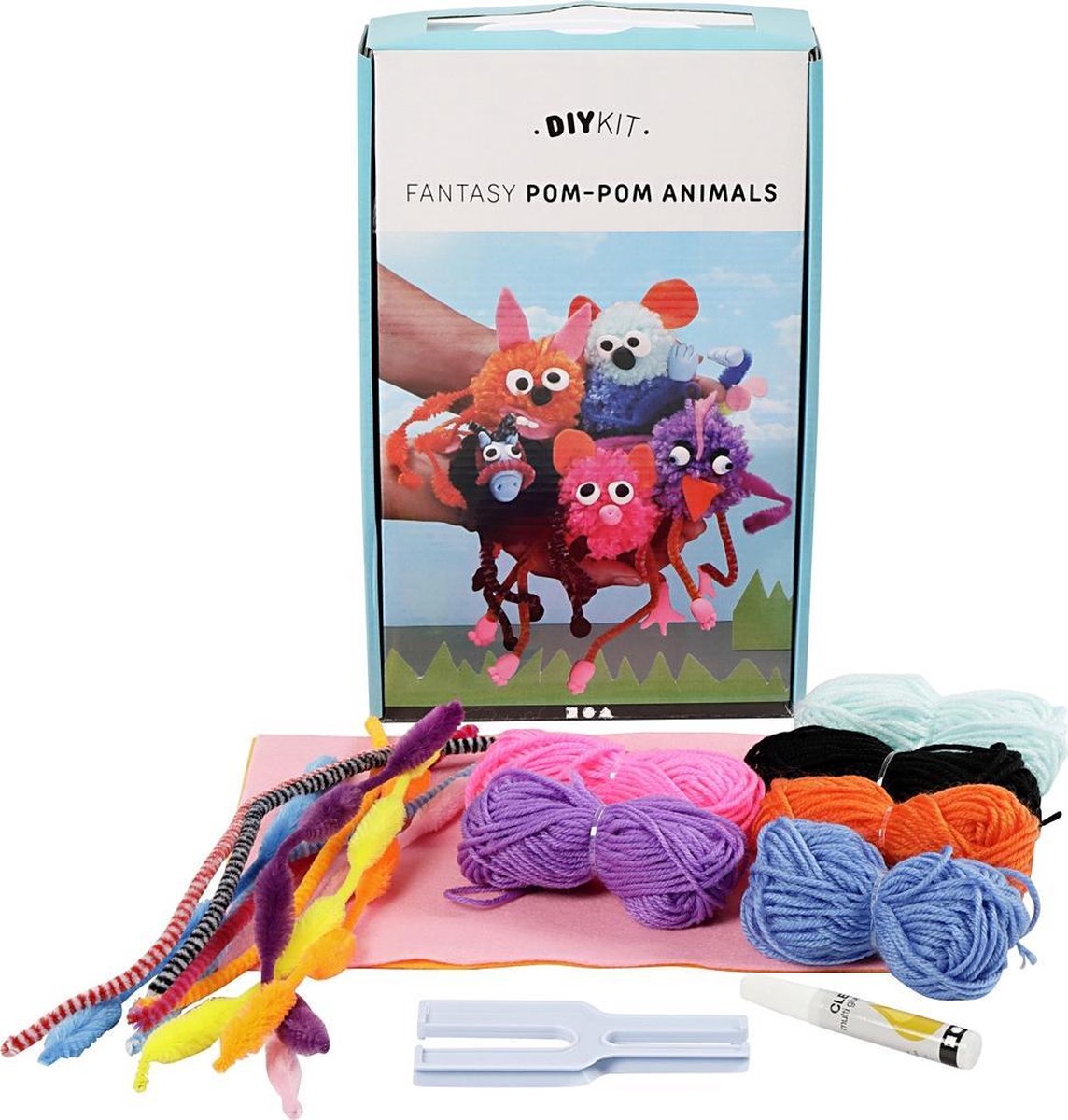 DIY Garen Kit - Dieren (1 sets) Materialen set om fantasiedieren te maken van pom-poms gemaakt van garen met chenille, vilt en Silk Clay voor de details. Inhoud: 6 bollen acryl garen, 2 vel acryl vilt, 20 stuks chenille draad, lijm, pom-pom makers en 1 doos Silk Clay met 4 kleuren.