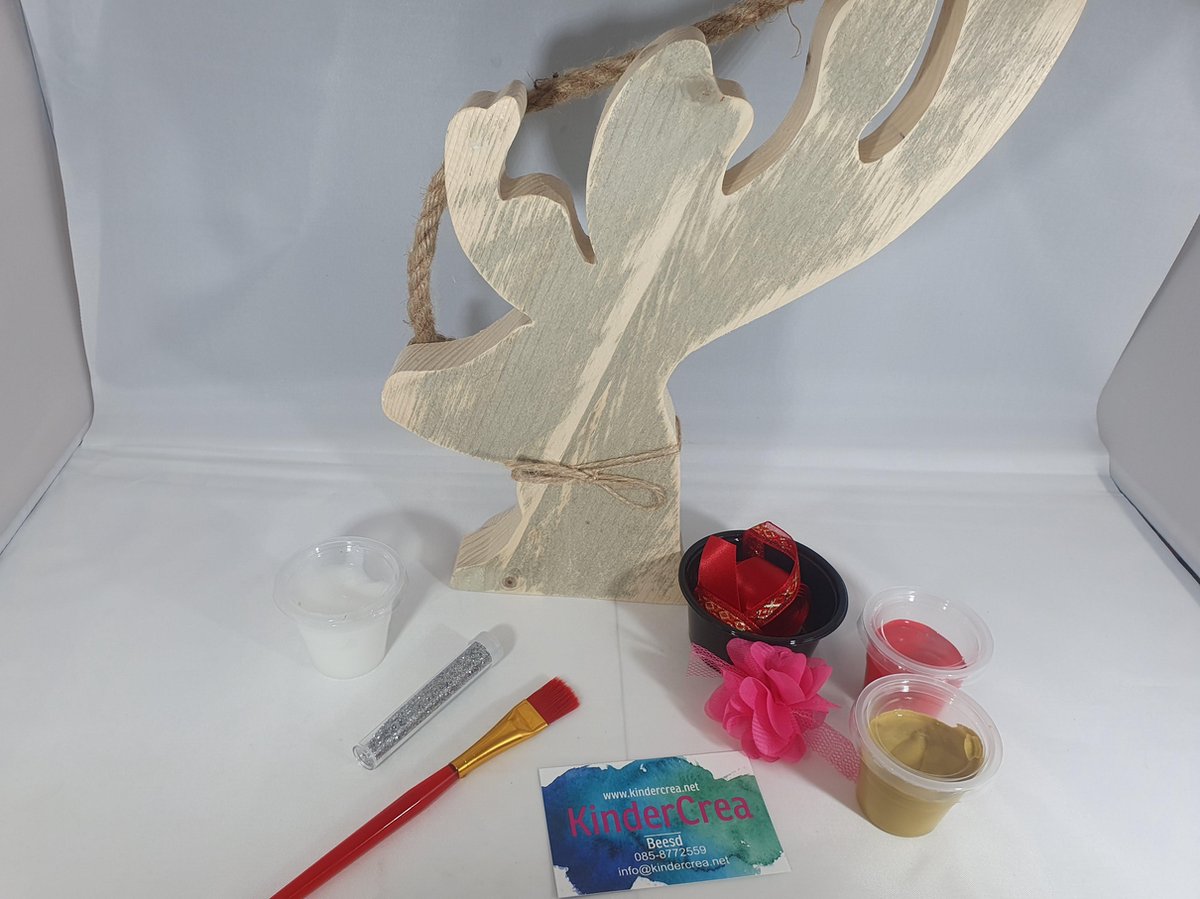 super leuk knutselpakket van KinderCrea. in het pakket zit een houten Rendier die kan hangen en kan staan als decoratie met alle materialen om hem te versieren zoals verf, lijm, kwast en versiersels.