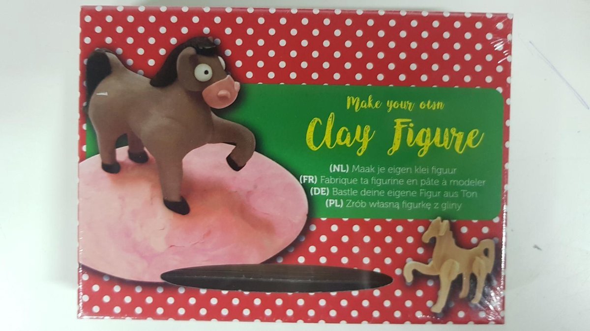 Setje met klei en houten figuurtje om een klei dinosaurus in elkaar te knutselen.