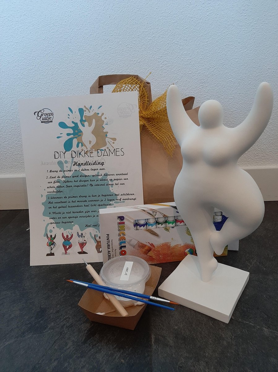 Compleet pakket bestaande uit: 1. Polystone wit beeldje van 20 cm hoog. 2. Primer 3. 12 kleuren acrylverf pakket 3. Dot pen 4. Twee pencelen 5. Drie dot watjes 6 Handleiding 7 Doseer bakje