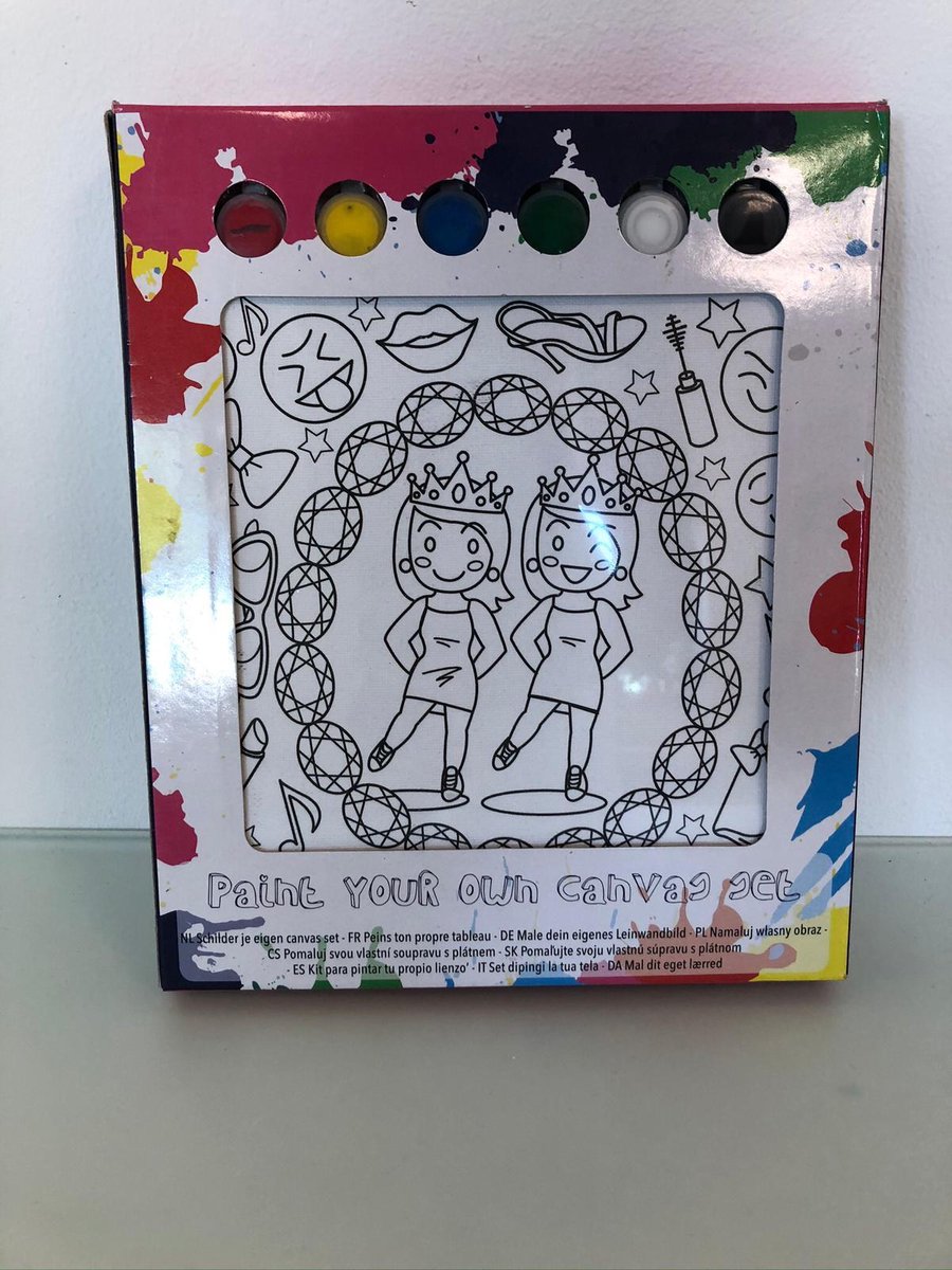 Leuk canvas met prinsessen afdruk. Het pakket bevat één canvas, 6 kleuren verf en één kwast.