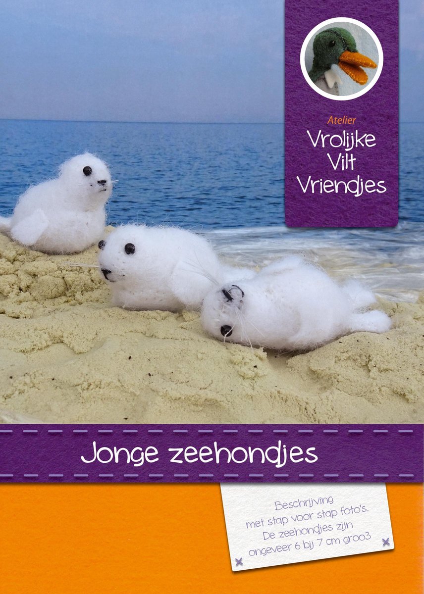 De jonge zeehonden zijn te maken uit 100% wolvilt. Beschrijving met stap- voor stap foto's. De zeehondjes zijn 6 bij 7 cm groot. Om deze zeehondjes te maken heeft u een slickerborstel nodig om de diertjes pluizig te maken. Drie pluizige zeehondjeste maken uit wolvilt. Inhoud: beschrijving met stap- voor stap foto's wolvilt splijtgaren vulwol kralen transparant garen pijpenrager Nog nodig: zwart aquarelpotlood slickerborstel naaigerei