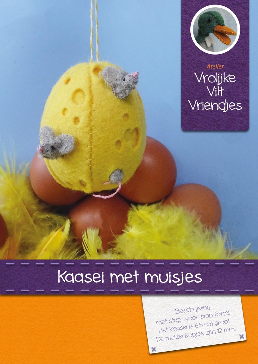 Pakket voor het maken van een kaasei, natuurlijk zijn de muizen dan ook van de partij. Het ei en de muizen zijn van 100% wolvilt. Het ei is 6.5 cm groot en de muizenkopjes 12 mm. Met uitgebreide beschrijving en stap- voor stap kleuren foto's.